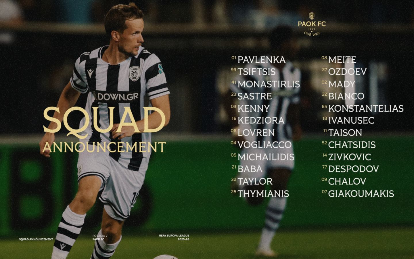 Την εν Ελλάδι προετοιμασία του για την εκτός έδρας αναμέτρηση με τη Θέλτα ολοκλήρωσε ο ΠΑΟΚ, με τον Ράζβαν Λουτσέσκου να ανακοινώνει την αποστολή, μετά το τέλος της προπόνησης της Τρίτης (30/9).