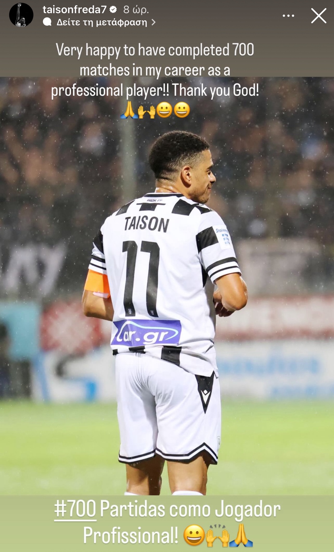 «Είμαι πολύ χαρούμενος που συμπλήρωσα 700 αγώνες στην καριέρα μου ως επαγγελματίας ποδοσφαιριστής! Ευχαριστώ τον Θεό!», ανέφερε χαρακτηριστικά σε ανάρτηση του στο Instagram.