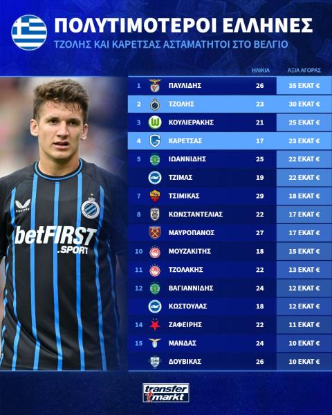 Πιο συγκεκριμένα, στη θέση νούμερο «8», και πρώτος ανάμεσα σε αυτούς που αγωνίζονται στην ελληνική Super League, βρίσκεται με 17 εκατομμύρια ευρώ ο Γιάννης Κωνσταντέλιας, ενώ ο Χρήστος Ζαφείρης, που από τον ερχόμενο Γενάρη θα φορά τη φανέλα του Δικεφάλου, βρίσκεται στη θέση νούμερο 14, με αξία 11 εκατομμυρίων ευρώ.