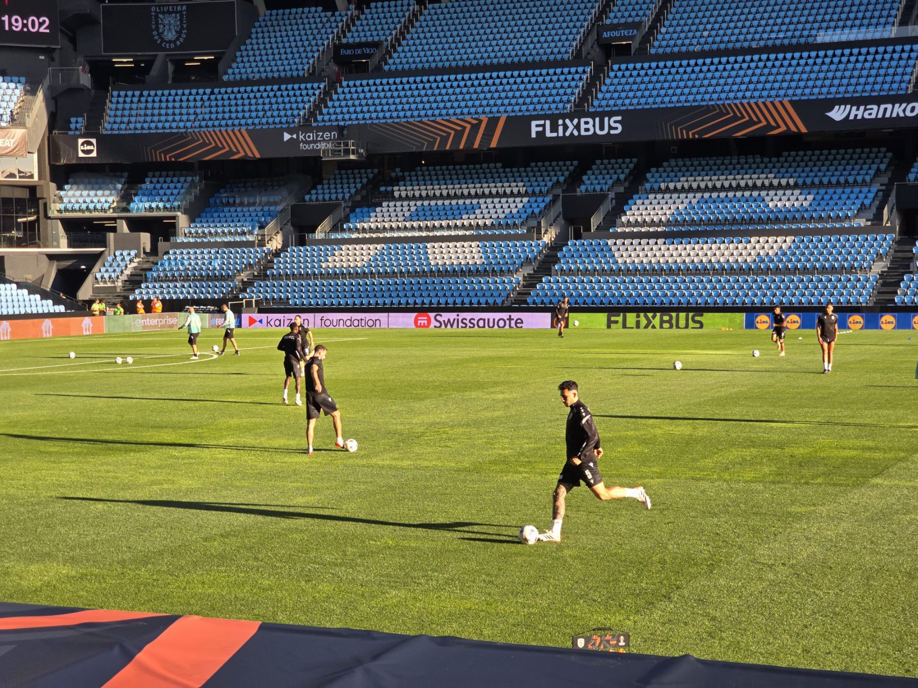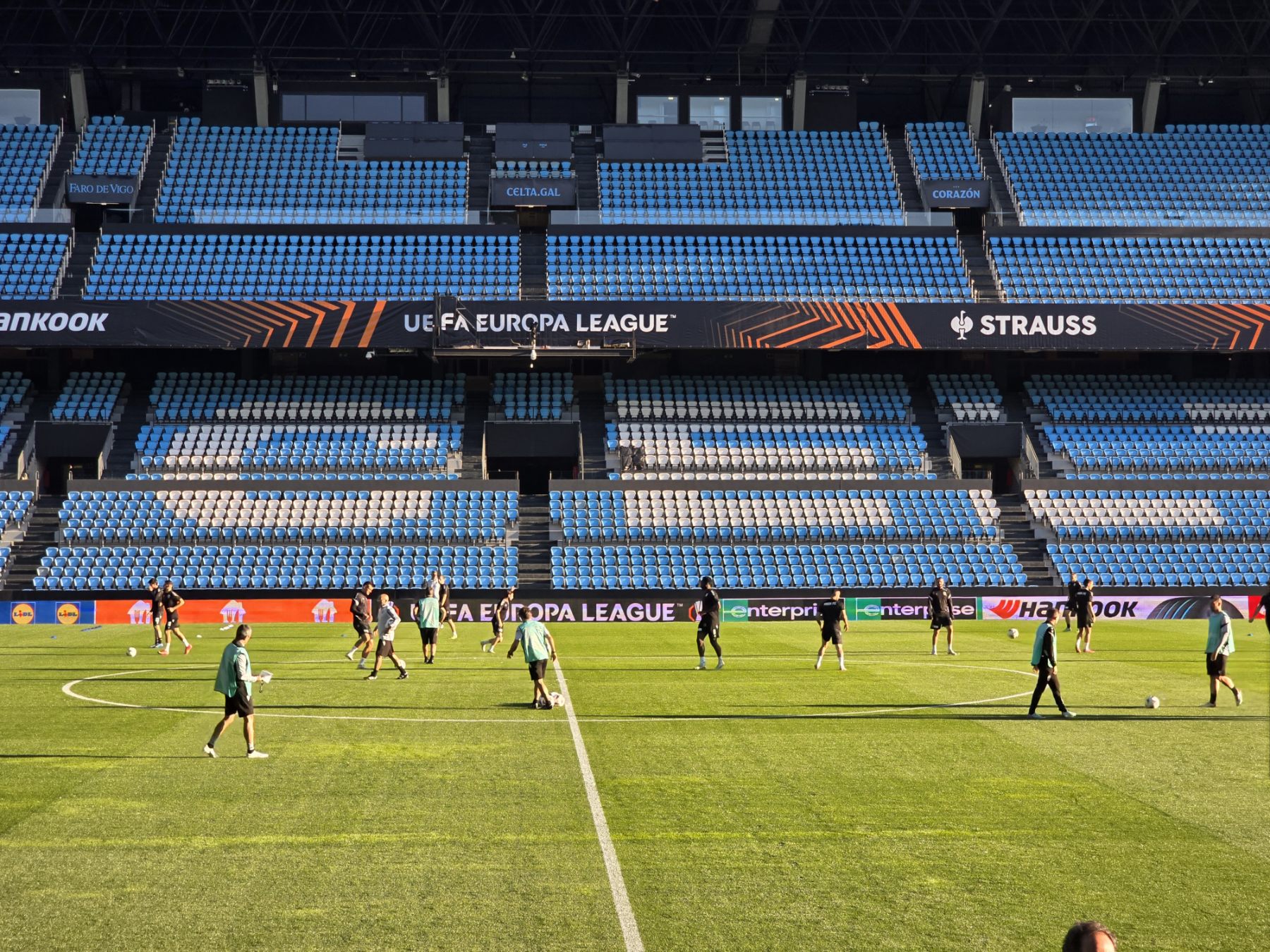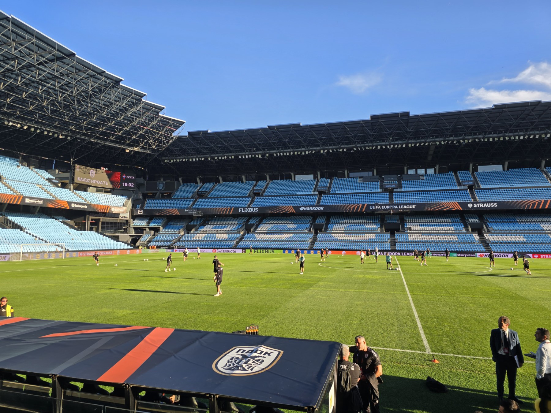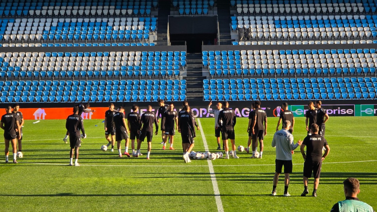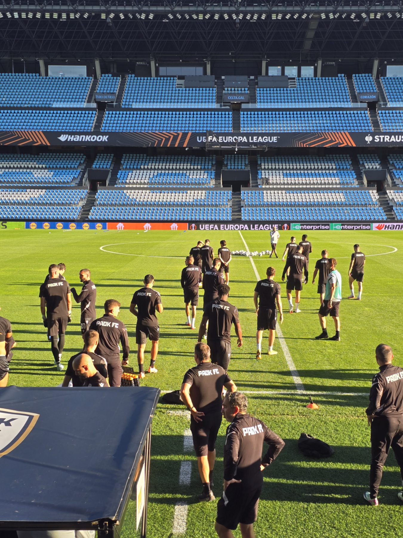 Μετά το τέλος της συνέντευξης Τύπου, οι ποδοσφαιριστές και το τεχνικό επιτελείο του ΠΑΟΚ βγήκαν στον αγωνιστικό χώρο του Μπαλαϊδος, για την πρώτη τους γνωριμία με το γήπεδο που θα αντιμετωπίσουν τη Θέλτα, αλλά και την τελευταία «πρόβα» πριν το κρίσιμο παιχνίδι.
