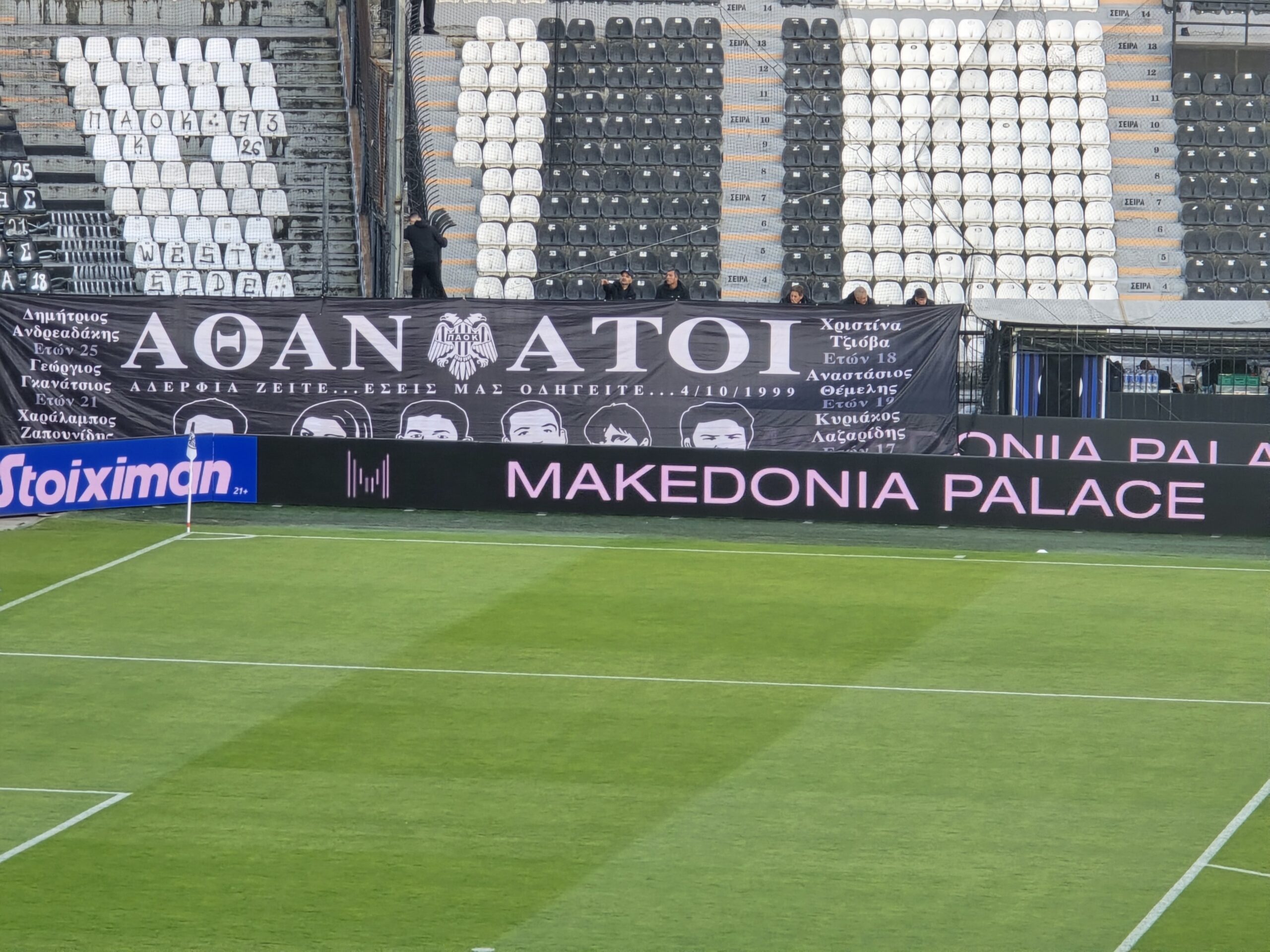 Αρκετή ώρα πριν τη σέντρα, έχει πάρει τη θέση του πανό στη μνήμη τους, ανάμεσα σε Θύρα 4 και Θύρα 5, όπως μπορείτε να διαπιστώσετε κι από την παρακάτω φωτογραφία: