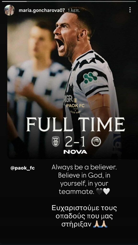 Λίγη ώρα μετά τη νίκη του ΠΑΟΚ στο ντέρμπι με τον Ολυμπιακό, η Μαρία Γκοντσάροβα έστειλε το δικό της μήνυμα, μέσα από τα social media.